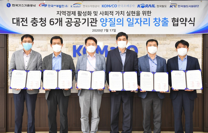 | ▲ 대전·충청 6개 공공기관의 양질의 일자리 창출 협약식. (왼쪽부터)한국서부발전 임정래 국정과제추진실장, 한국가스기술공사 심문철 상생협력처장, 한국철도시설공단 장동일 상생협력부장, 한국수자원공사 이병근 인재경영처장, 한국철도공사 김진수 일자리창출팀장, 한국조폐공사 최재희 사회적가치처장. |