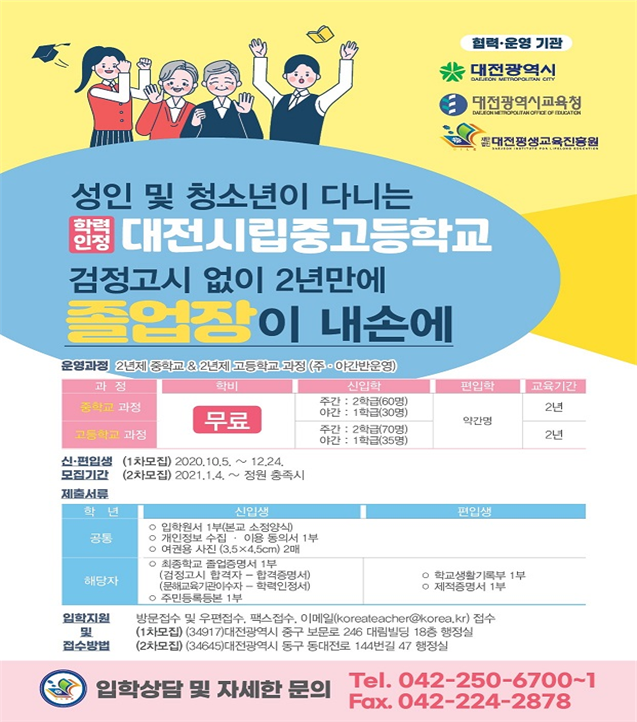 한편 학력인정 대전시립중고는 배움의 시기를 놓친 성인 학습자들을 위해 대전시와 대전시교육청, 대전평생교육진흥원이 협력해 운영하는 2년제 중·고로 지난 3월 개교해 현재 중학교 107명, 고등학교 97명이 재학 중이다.