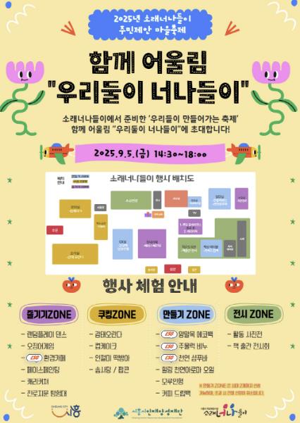 시흥시 학교복합시설 소래너나들이센터는 오는 9월 5일 오후 2시 30분부터 오후 6시까지 주민이 직접 기획ㆍ운영에 참여한 주민 제안형 마을축제 ‘함께 어울림 우리 둘이 너나들이’를 개최한다.