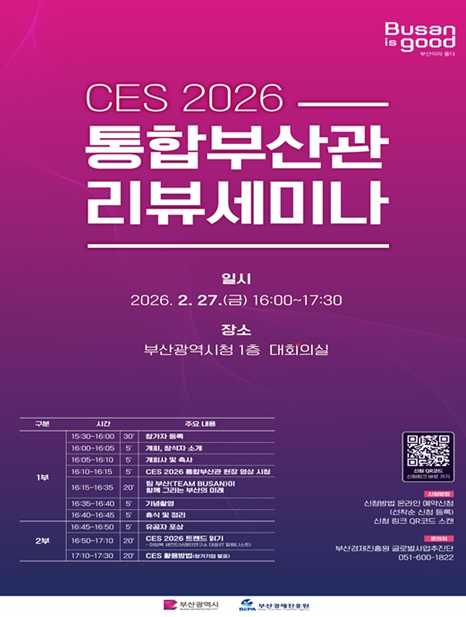 부산시는 오늘(27일) 오후 4시 시청 대회의실에서 'CES 2026 통합부산관' 리뷰 세미나를 개최한다고 밝혔다.