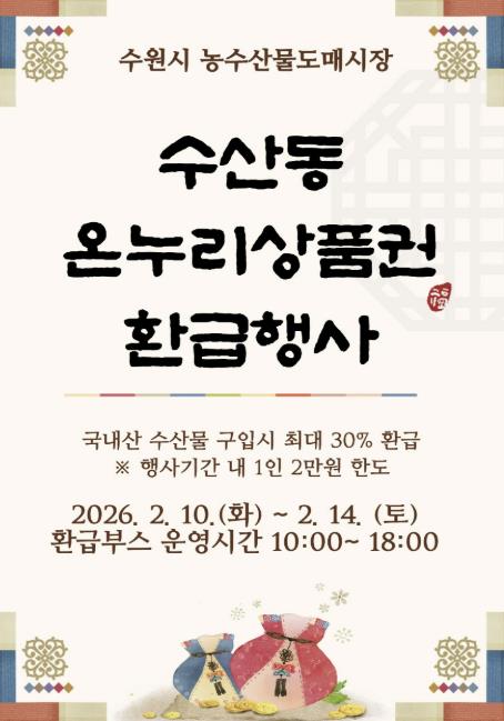수원시농수산물도매시장 수산동이 설을 맞아 2월 10일부터 14일까지 온누리상품권 환급 행사를 연다.