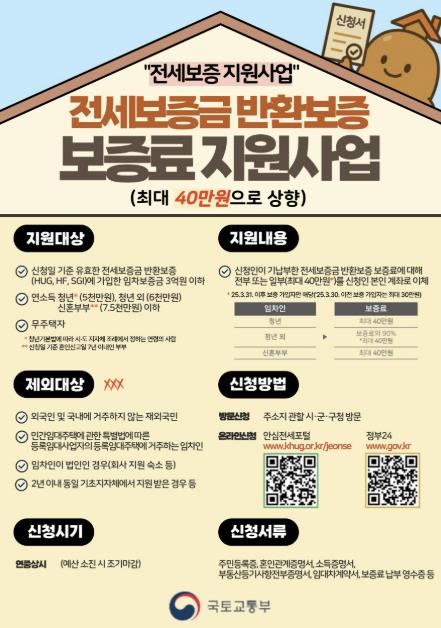 이 사업은 보증기관에 가입할 때 납부해야 하는 보증료를 가구당 최대 40만 원까지 지원한다.