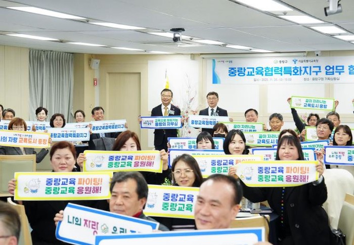 중랑구는 11월 26일 구청 4층 기획상황실에서 서울특별시교육청과 ‘중랑교육협력특화지구’업무협약을 체결했다. 이번 협약은 2019년 혁신교육지구, 2023년 미래교육지구 추진에 이어 지역 교육 협력사업을 확장하는 단계로, 구·교육청·학교 간 협력 구조를 체계화해 지역 기반 교육 환경을 강화하기 위해 마련됐다.
