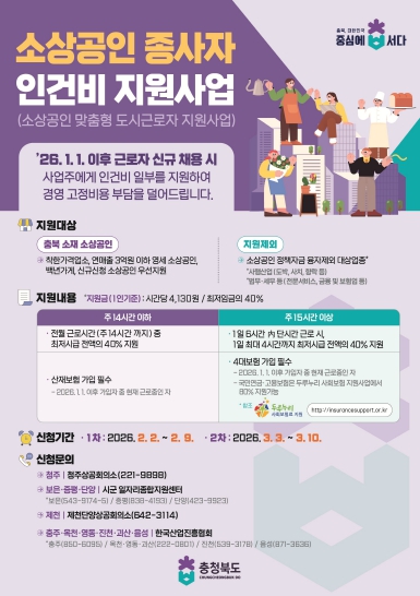 김영환 지사는 “민생경제의 뿌리이자 서민 삶의 터전인 전통시장이 최근 인력난과 고령화로 어려움을 겪고 있다”며 “도시근로자 사업을 통해 소상공인에게는 인건비 부담 완화를, 구직자에게는 일자리를 제공하는 상생의 마중물이 되길 기대한다”고 말했다.