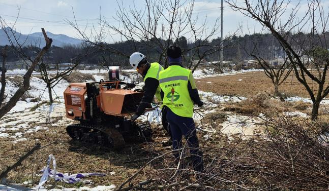 ▲ 지난 2월 영농 부산물 파쇄단이 농가를 찾아 영농 부산물 파쇄를 지원하는 모습 |