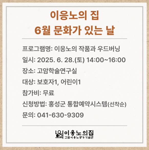 충남 홍성군 고암이응노생가기념관(이하 이응노의 집)이 오는 25일과 28일 양일간 ‘6월 문화가 있는 날’ 프로그램을 운영한다고 밝혔다.