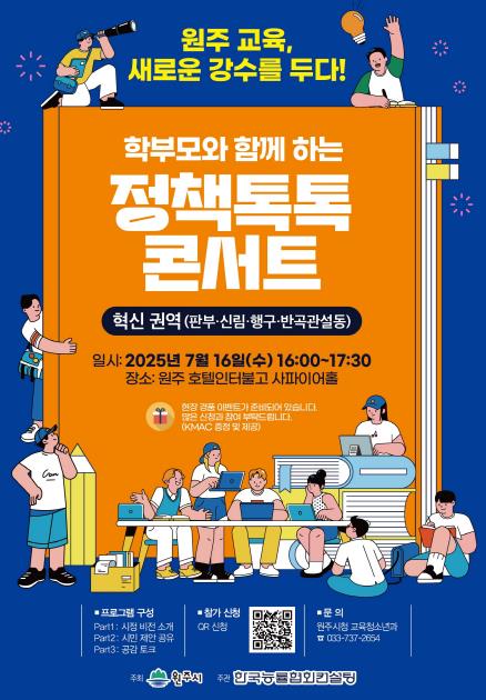 원주시는 교육정책에 대한 시민들의 의견을 직접 듣고, 실효성 있는 정책을 수립하기 위해 오는 7월부터 ‘원주 교육, 새로운 강수를 두다!’ 토크콘서트를 권역별 순차 개최한다.