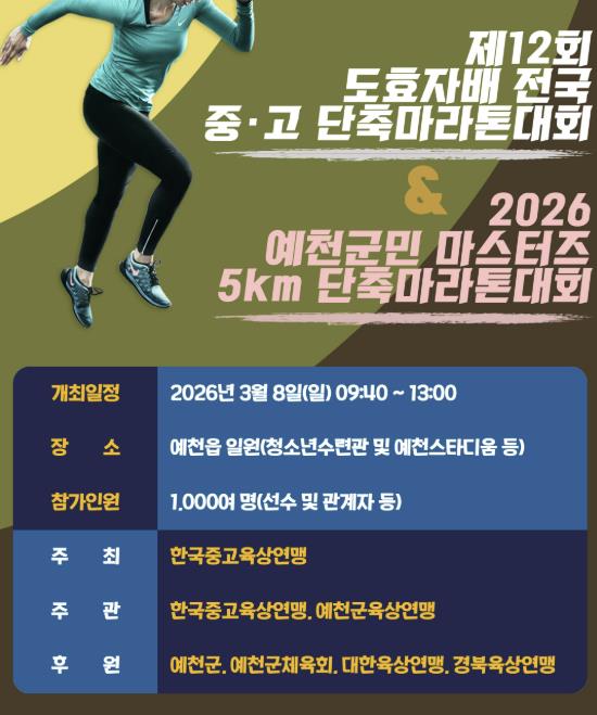 예천군은 오는 8일 오전 10시부터 예천읍 일원에서 '제12회 예천 도효자배 전국 중·고 단축마라톤대회' 및 '2026 예천군민 마스터즈 단축마라톤대회'를 개최한다고 밝혔다.