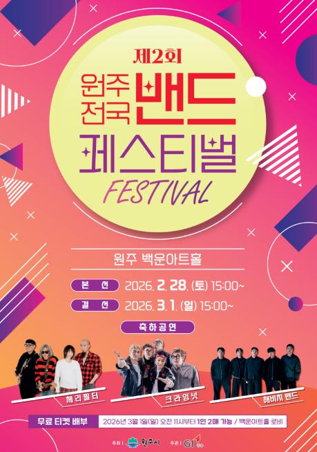 2026 제2회 원주 전국 밴드 페스티벌이 오는 2월 28일부터 3월 1일까지 2일간 백운아트홀에서 개최된다.