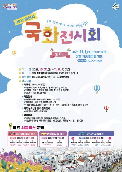 아산시는 깊어가는 가을 정취를 만끽할 수 있는 ‘2025년 아산시 국화전시회’를 오는 10월 31일부터 11월 6일까지 7일간 탕정면 지중해마을 일원에서 개최한다고 밝혔다.