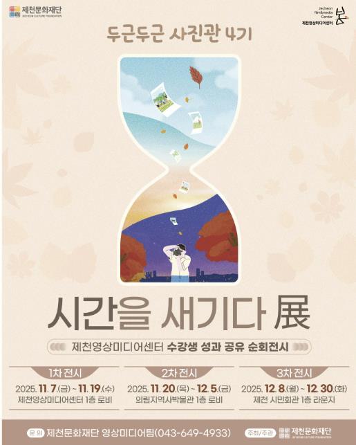 제천문화재단이 제천영상미디어센터 교육 수강생들의 작품을 순회 전시하는 '두근두근 사진관 4기 : 시간을 새기다 展'을 오는 11월 7일부터 12월 30일까지 제천시 일원에서 개최한다.