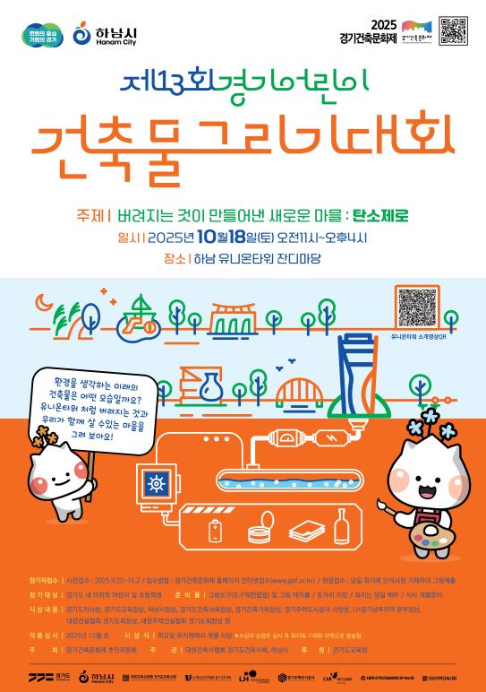 건축에 관심 있는 어린이들이 참가하는 ‘어린이건축물그리기대회’도 10월 18일 유니온타워 야외 잔디마당에서 진행된다. 이번 대회의 주제는 ‘버려지는 것이 만들어낸 새로운 마을 : 탄소제로’로, 경기도 내 미취학 아동과 초등학생이 참여할 수 있다. 대회를 통해 아이들은 자신만의 상상력을 발휘해 지속 가능한 미래의 건축물을 그리며, 건축에 대한 흥미와 이해를 높일 수 있을 것이다.
