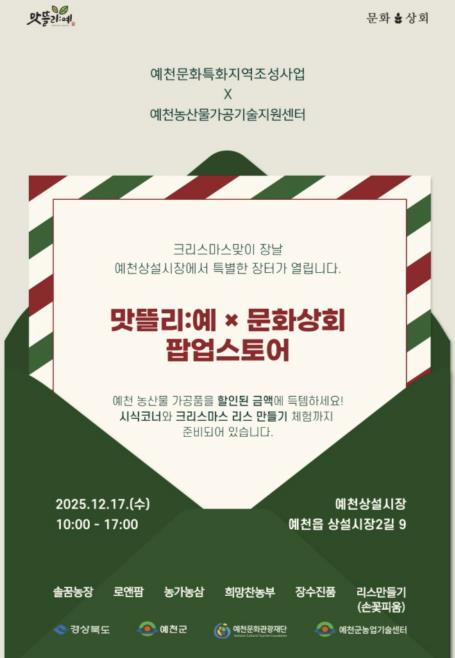 예천군과 예천문화관광재단은 17일, 예천상설시장 ‘문화상회’에서 크리스마스를 맞아 ‘문화상회 X 맛뜰리:예’ 프로그램을 개최한다.