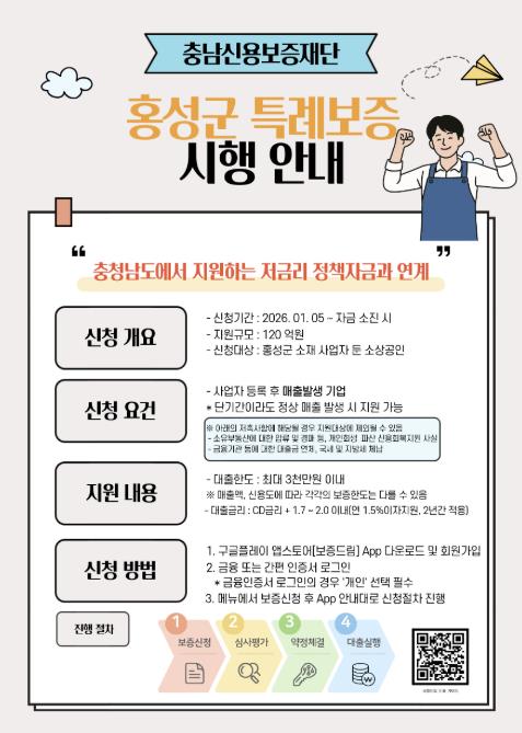 신청 대상은 홍성군에 사업장을 두고 영업 중인 소상공인이며, 업체당 보증 한도는 최대 3천만 원 이내이다. 상환 방식은 ▲2년 거치 일시상환 ▲2년 거치 3년 균분상환 ▲2년 거치 5년 균분상환 중 선택할 수 있다.