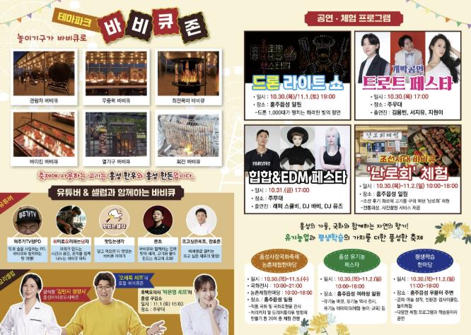 홍성군은 오는 10월 30일부터 11월 2일까지 홍주읍성 일원에서 열리는 ‘2025 홍성글로벌바비큐페스티벌’을 중심으로 국화축제, 유기농 페스타, 평생학습 한마당, 상설시장 행사 등 다채로운 즐길거리를 함께 선보인다.