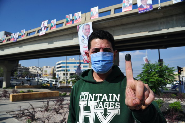 (프레스뉴스)채정병 특파원=10일(현지시간) 130석의 국회의원을 선출하는 제19대 요르단 총선이 전국적으로 실시된 가운데 한 남성이 투표소에서 받은 손가락 인증잉크를 보여주고 있다.