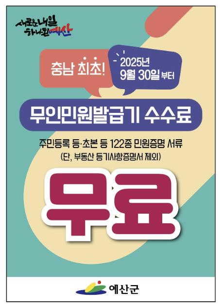 예산군이 9월 30일부터 충청남도 내 최초로 무인민원발급기 민원증명 수수료를 충남도내 최초로 전면 무료화한다고 밝혔다.