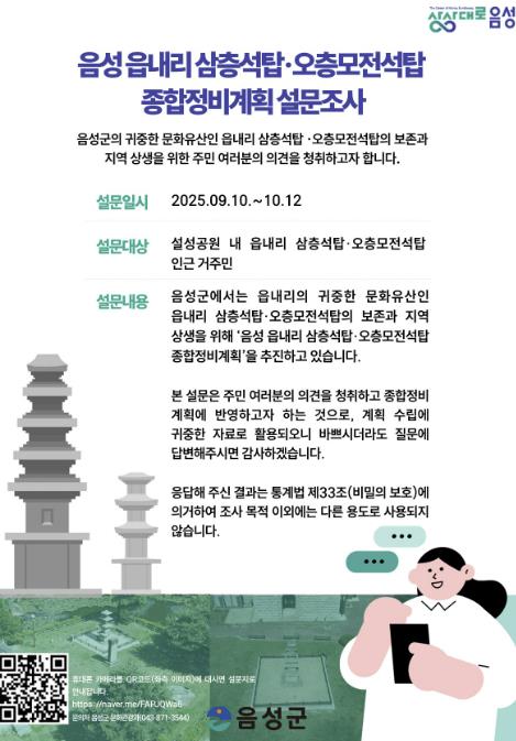 음성군은 읍내리 설성공원 일원에 위치한 ‘음성 읍내리 삼층석탑’ 및 ‘음성 읍내리 오층모전석탑’의 종합정비계획을 수립하는 과정에서 주민 의견 수렴을 위한 온라인 설문조사를 실시한다고 밝혔다.