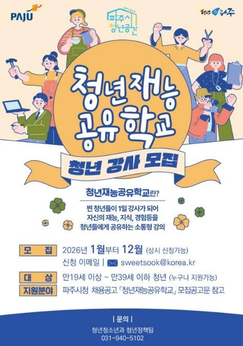 파주시는 2026년 1월부터 12월까지 청년을 대상으로 '청년재능공유학교' 청년강사를 연중 상시 모집한다.