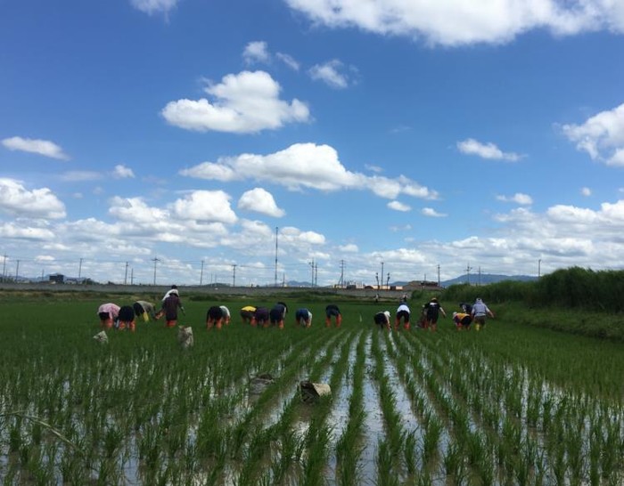 | ▲ 권선구 평리동 일대 논에서 농업인과 시민들이 친환경 김매기 활동을 하고 있다 |