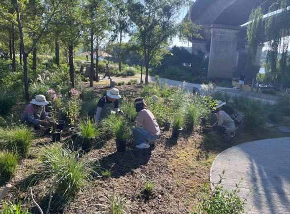 | ▲ 성동구 한강 시그니처 정원에서 가을철 보식 작업을 하고 있는 마을정원사들 모습 |