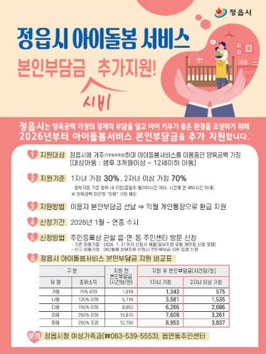 “아이 키우기 좋은 정읍”…올해부터 아이돌봄 본인부담금 최대 70% 지원