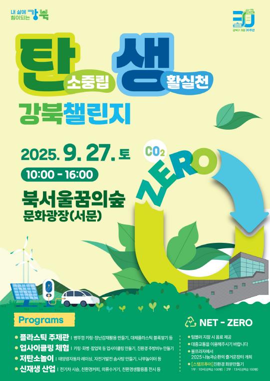 서울 강북구는 오는 9월 27일 오전 10시부터 오후 4시까지 북서울꿈의숲 일대에서 ‘탄생 강북 챌린지(탄소중립 생활실천 강북 챌린지)’와 ‘2025 나눔과 순환의 즐거운 장터’를 개최한다.