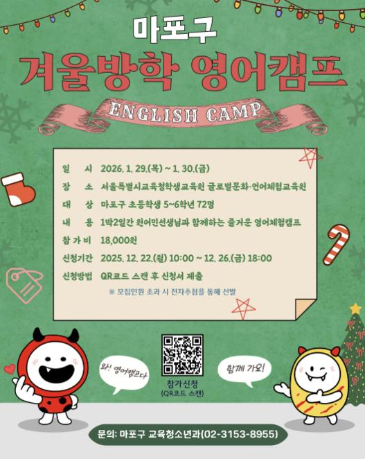 마포구는 겨울방학을 맞아 관내 초등학교 5~6학년 학생 72명을 대상으로 2026년 1월 29일부터 30일까지 1박 2일 일정의 겨울방학 영어캠프를 운영한다.