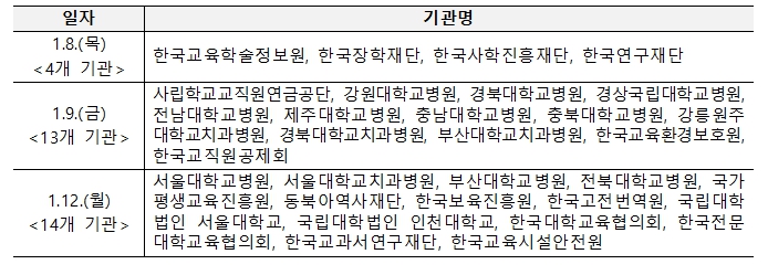 교육부는 1월 8일부터 1월 12일까지 3일에 걸쳐 소관 공공기관과 주요 유관기관으로부터 업무보고를 받았다. 이번 업무보고는 각 기관이 본연의 임무를 충실히 이행하고 있는지 점검하기 위해 마련됐으며, 특히, 한국장학재단 등 지역으로 이전한 기관에는 지역 균형발전에 기여하기 위해 노력하고 있는지도 확인했다.