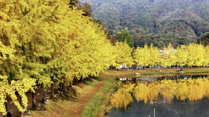 가을 절정의 노란 은행잎이 저수지를 감싸며 장관을 이루고, 인근 논에서는 유색벼로 만든 김홍도의 풍속화 ‘무동’을 감상할 수 있다.
