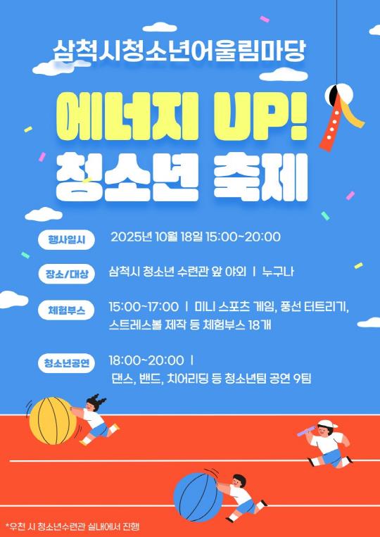 삼척시청소년수련관은 오는 10월 18일 오후 3시부터 관내 청소년과 가족을 대상으로 2025 삼척시청소년어울림마당 『에너지 UP! 청소년축제』를 개최한다.