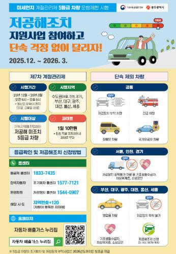 광주광역시는 12월1일부터 내년 3월31일까지 4개월간 ‘제7차 미세먼지 계절관리기간’으로 운영, 저공해 조치를 하지 않은 배출가스 5등급 차량의 운행을 제한한다.