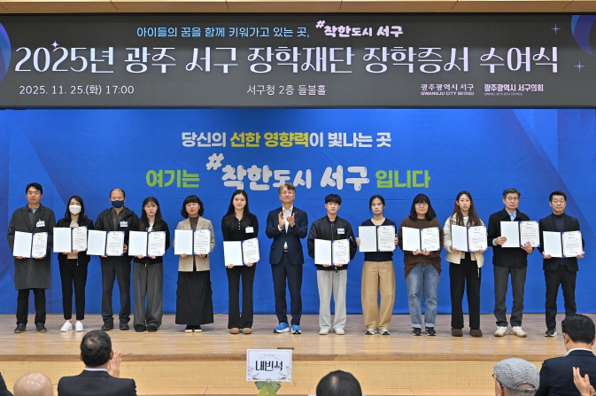 (재)광주광역시서구장학재단(이사장 박찬갑)은 지난 25일 서구청 들불홀에서 ‘2025년 장학증서 수여식’을 열고 관내 장학생 125명에게 장학금 총 1억9천여만원을 전달했다.