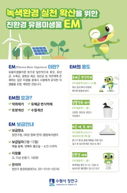 수원시 장안구 관계자는 “2026년에도 시민들의 많은 관심과 참여를 부탁드린다”며 “EM 보급을 통해 시민들이 일상 속에서 친환경 생활을 실천하는 데 도움이 되길 기대한다”고 말했다.