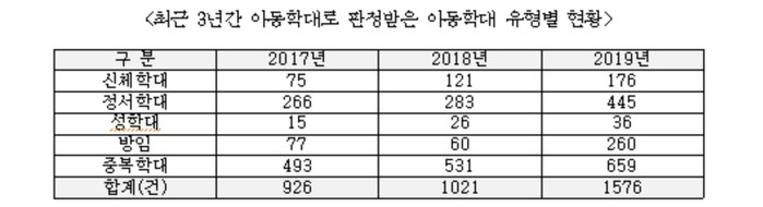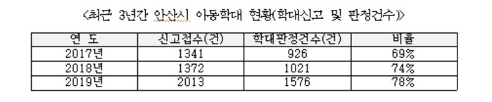 최근 3년간 안산시 아동학대 신고접수와 학대판정건수(비율)을 보면, 2017년 신고접수 1341건 중 학대판정건수가 926건(69%), 2018년 신고접수 1372건 중 학대판정건수 1021건(74%), 2019년 신고접수 2013건 중 학대판정건수 1576건(78%)으로 매년 늘고 있다.