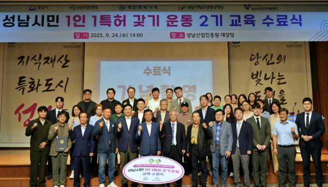 성남산업진흥원은 9월 24일(수) 대강당에서 『성남시민 1인 1특허 갖기 운동』 제2기 교육 수료식을 개최하고, 시민 지식재산 역량 강화의 성과를 공유했다.