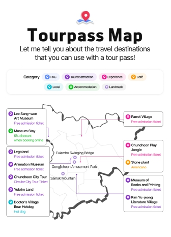 ‘춘천투어패스’는 레고랜드 코리아 리조트와 애니메이션박물관, 플레이정글, 곰핫도그, 스톤플랜트, 이상원미술관&뮤지엄스테이, 책과인쇄박물관, 김유정문학촌, 앵무새마을, 육림랜드, 춘천시티투어 등 총 11개 관광지를 하나의 모바일 티켓으로 자유롭게 이용할 수 있는 통합 관광 상품이다.