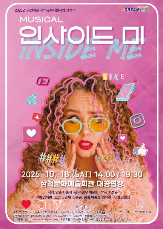 삼척시는 2025년 공연예술 유통지원사업의 일환으로 뮤지컬 인사이드 미를 오는 10월 18일 삼척문화예술회관 대공연장에서 선보인다.