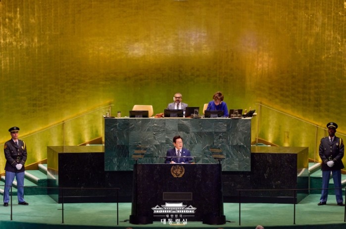 저는 오늘 세계 평화와 인류 공영의 미래를 논의할 이 유엔총회에서, 세계 시민의 등불이 될 새로운 대한민국이 국제사회에 완전히 복귀했음을 당당하게 선언합니다.