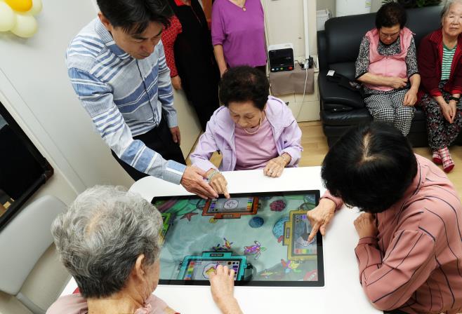 건전한 여가활동 지원 분야의 핵심 수단으로는 스마트 테이블이 설치됐다. 기능성 책상인 스마트 테이블은 놀이 프로그램이 탑재돼 있다. 그중 두뇌 훈련형 콘텐츠는 어르신의 치매 예방에도 도움이 되어 복지관 등에 확산되고 있다.
