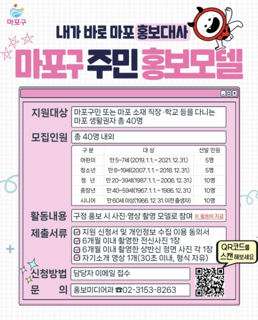 마포구는 1차 서류심사와 2차 전문가 심사를 거쳐 10월 말 최종 홍보모델을 선정하고, 11월 위촉식을 진행할 예정이다.