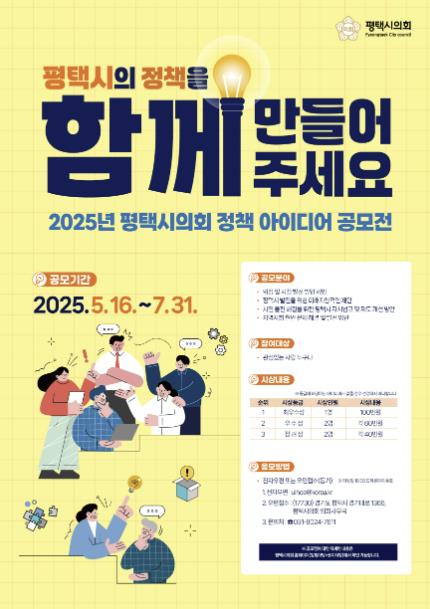 평택시의회는 지역 발전을 위한 참신한 해법을 시민과 함께 모색하고자 '2025년 평택시의회 정책 아이디어 공모전'을 5월 16일부터 7월 31일까지 진행한다고 밝혔다. 이번 공모전은 시민이 제안한 아이디어를 의정과 시정에 반영해 실질적인 변화를 이끌기 위한 것으로, 누구나 참여할 수 있다.