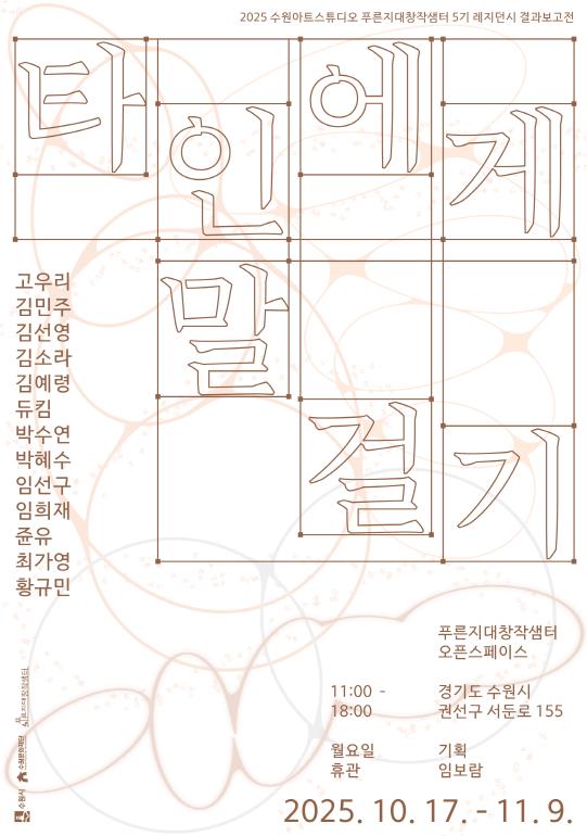 수원문화재단은 오는 10월 17일부터 11월 9일까지 약 3주간 탑동 시민농장에 자리한 수원아트스튜디오 푸른지대창작샘터에서 5기 레지던시 참여작가 13인의 올 한 해 작품 활동 성과를 공유하는 결과보고전 '타인에게 말 걸기'를 개최한다.