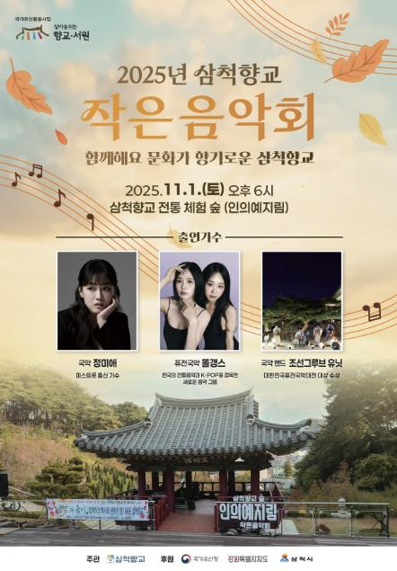 삼척향교는 오는 11월 1일 오후 6시, 삼척향교 전통체험숲 ‘인의예지림’에서 '함께해요 문화가 향기로운 삼척향교 작은음악회'를 개최한다.