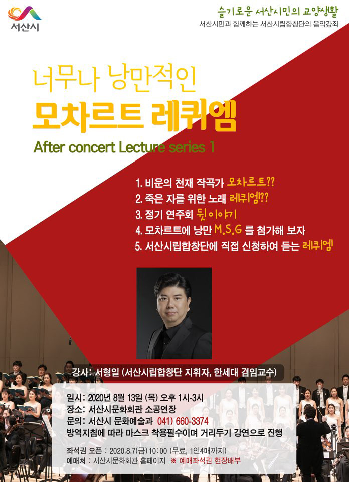서산시립합창단의 지휘자이자 한세대 합창전문대학원의 지휘과 서형일 겸임교수가 ‘너무나 낭만적인 모차르트 레퀴엠’이라는 주제로 강의를 진행한다.