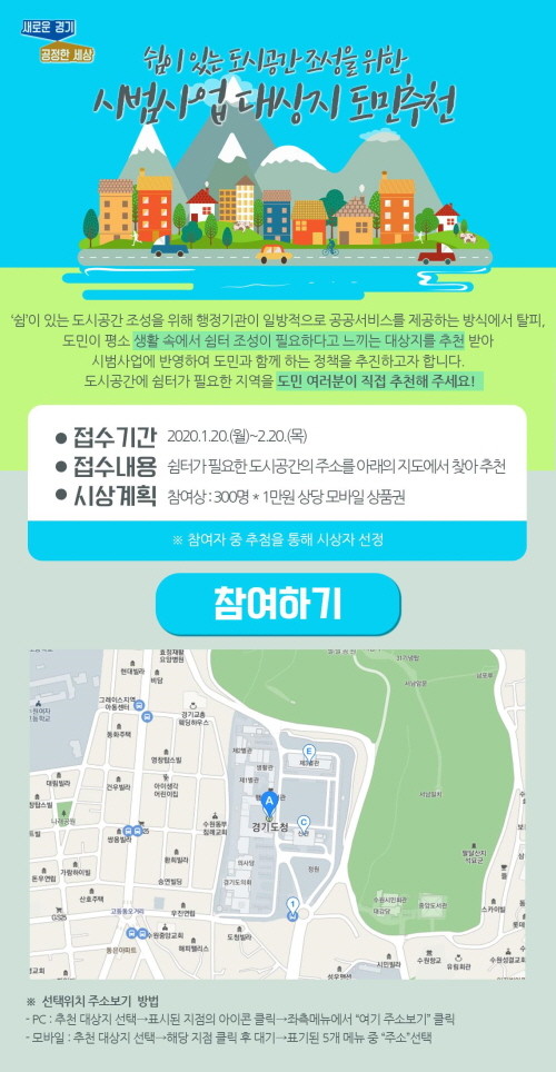 이번 도민 의견 수렴은 정책브리핑 시 발표한 6개 실행과제 중 ‘도민참여형 정책설계 및 추진’의 일환으로, 그 동안 행정기관 주도로 계획을 수립하고 정책수요자에게 일방적으로 공공서비스를 제공하는 방식에서 탈피, 도민이 평소 생활 속에서 쉼터 조성이 필요하다고 느끼는 대상지를 추천 받아 시범사업 대상지 선정에 반영하기 위해 마련했다.