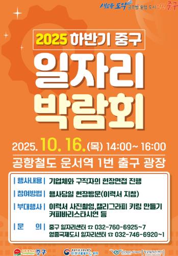 인천시 중구는 오는 16일 공항철도 운서역 1번 출구 앞 광장에서 ‘2025 하반기 중구 일자리 박람회’를 개최한다고 밝혔다.