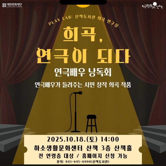 제천문화재단(이사장 김상수)이'2025년 문학상주작가 지원사업'의 일환으로 상주작가와 마지막 문학프로그램인 '희곡, 연극이 되다' 연극배우 낭독회를 오는 18일 하소생활문화센터 산책에서 선보인다.