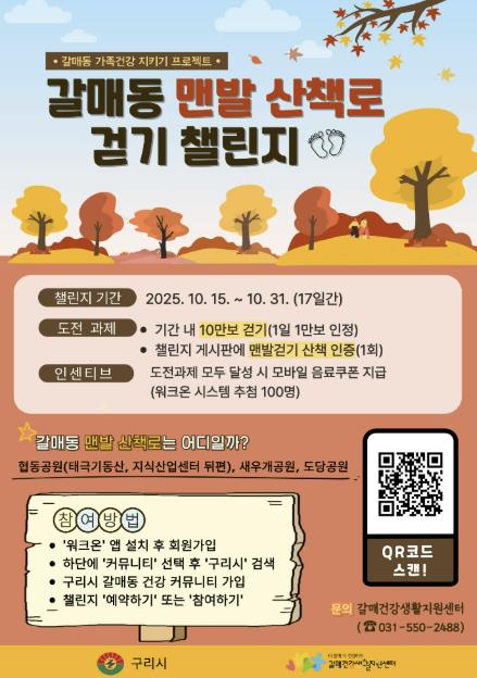 구리시는 가을철 주민들의 건강한 생활 습관 형성과 스트레스 완화를 위해 ‘갈매동 맨발 산책로 걷기 챌린지’를 오는 10월 15일부터 31일까지 17일간 운영한다고 밝혔다.