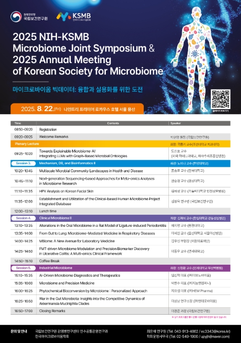 행사에서는 도신호 교수(하버드대학교 매사추세츠종합병원)의 기조강연 ‘Towards Explainable Microbiome-AI: Integrating LLMs with Graph-Based Microbial Ontologies(설명 가능한 마이크로바이옴 인공지능을 향하여: 최신 언어모델과 미생물 온톨로지 통합)’를 시작으로, 병원 기반 마이크로바이옴 데이터베이스 구축 및 활용, 마이크로바이옴 빅데이터를 활용한 임상·산업 적용 사례, 정밀의료와 차세대 치료제 개발 가능성 등 다양한 주제 발표가 이어진다.